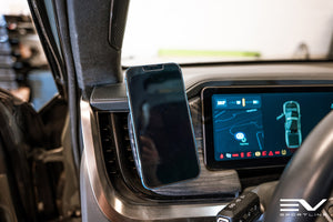 First, this kit was designed to position phones on the left side, out of the way of the shifter on the right side. Second, we refused to settle for a plastic 3D printed bracket, which is prone to flexing, jiggling over bumps, or worst of all breaking under load. This kit features a proper CNC formed aluminum alloy metal bracket, the highest of quality and most secure and rigid of mounts. Next, this kit does not use any double-sided tape, nor any 'clips' to hold in place. The Patented Team 1EV mount is creatively formed to slip under the dash pad and fasten to the Rivian frame using an existing mounting bolt. No modifications, no cutting, no drilling! Next, the MagSafe charger is offered at two power profiles. Choose Qi1 for standard (slow) charging or option with our new Qi2 puck for the latest fast charging protocol. The MagSafe mount is fully adjustable, allowing the owner to adjust the angle exactly to personal preference. As for power, the kit includes a plug-and-play Power supply and cables that provide an easy installation. no unsightly wire is left running down or around the steering wheel! Once installed, this premium phone mount looks right at home as if Rivian designed it!