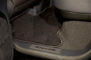 Protect your Rivian R1T floor and cargo spaces with precision fitment carpet mats from Team 1EV. These floor mats and gear mats are made from premium automotive grade, stain-resistant 28 oz rubber no-slip grip backed black carpet, cnc-cut and edge hemmed specifically to Rivian templates created by our engineers to maximize coverage. Besides protection, the mats also create a layer that dampens noise, further offering a smoother and quieter cabins. The Team 1EV mats offer high wear and stain resistance, ready to last in the rugged R1T environment. We are proud to make these mats in the USA 🇺🇸