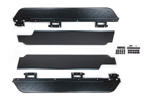 Material specifications are equally suited for the street, overlanding or Moab, take your pick, you're covered. Running boards start with CNC-bent 1.75" OD alloy steel tubing with laser cut welded frame bracketry and steel plate step surface plates. We finish all surfaces with a rugged textured black powder coating. Running boards are rated for 1000lbs load. Sliders are engineered for full confidence, starting with heavy wall 2" square tubing bolstered by several direct frame attachment points and triangulations.