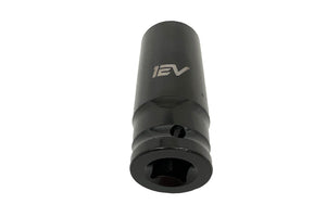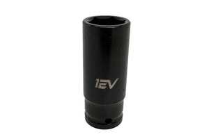 The Team 1EV Lug Nut Removal Socket for Rivian R1T / R1S is a high quality, deep wall, impact grade, chrome moly, black hard coated 1/2 drive socket. The Rivian spec socket is the proper 22mm hex, matching factory Rivian Lug Nuts used on all Rivian wheels.