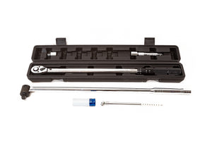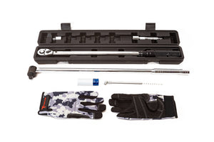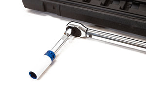 Team 1EV has created a convenient kit including all the hand tools required to safely and properly install Porsche Taycan and Audi e-Tron wheel and tire packages. The kit starts with a high quality 'paint protecting / no scratch / non-marring polymer coated 19mm deep impact socket, properly specified for use with all Porsche / Audi and Team 1EV wheels and factory lug bolts. Next, the kit includes a 24" breaker bar which is used to loosen lug bolts. For precision tightening of lug bolts, we include an easy to use clicker type torque wrench, suitable for Porsche/Audi-spec 118 ft-lb lug torquing. The torque wrench also includes a polymer storage case, 1/2" extension, and 3/8" adapter.