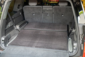 All Team 1EV mats are made from premium, OEM automotive grade stain-resistant carpet and CAN safely get wet, no different than how cab carpet and factory floor mats get wet in the rain or snow weather. The rear cargo mat is a precision fit, covering every inch of the open floor, carefully CNC-cut to the precise Rivian R1S floor shape. Team 1EV mats can be hosed off and washed clean as desired (and be air /sun dried). The rear cargo mat is perfect protection when hauling gear & cargo. Team 1EV mats make a perfect base for air mattress, tent, gear bags, coolers - ready for overlanding, adventures, and tailgating. Your pets and kiddos will love playing on the carpet in the rear while parked and tailgating!