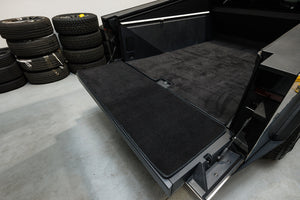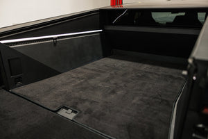 Protect your Tesla Cybertruck bed and tailgate with precision fitment carpet mats from T Sportline. These bed floor & tailgate mats are made from premium automotive grade, stain-resistant 28 oz rubber no-slip grip backed black carpet, cnc-cut and edge bound specifically to Cybertruck templates created by our engineers to maximize coverage. Besides protection, the mats also create a layer that dampens noise and rattles from your cargo sliding around. The T Sportline mats offer high wear and stain resistance, ready to last in the rugged Cybertruck environment. Cybertruck bed mat and tailgate mat are made from premium, OEM automotive grade stain-resistant carpet and CAN safely get wet, no different than how cab carpet and factory floor mats get wet in the rain or snow weather. The bed mat is a precision fit in the bed, covering every inch of the bed floor, carefully CNC-cut to the precise Cybertruck bed shape. It can be left in the bed full time or can easily be rolled up and stored, if desired. The tailgate mat covers the full tailgate surface when the tailgate is lowered, but does not attach to the tailgate - just stash it in the bed when not in used. The mats can be hosed off and washed clean as desired (and be air /sun dried). The bed mat is perfect protection when hauling gear & cargo in the bed and don’t want it sliding around scratching the factory Tesla bed liner! The bed and tailgate mats make a perfect base for air mattress, tent, gear bags, coolers - ready for overlanding, adventures, and tailgating. Your pets and kiddos will love playing on the carpet in the bed while parked and tailgating!