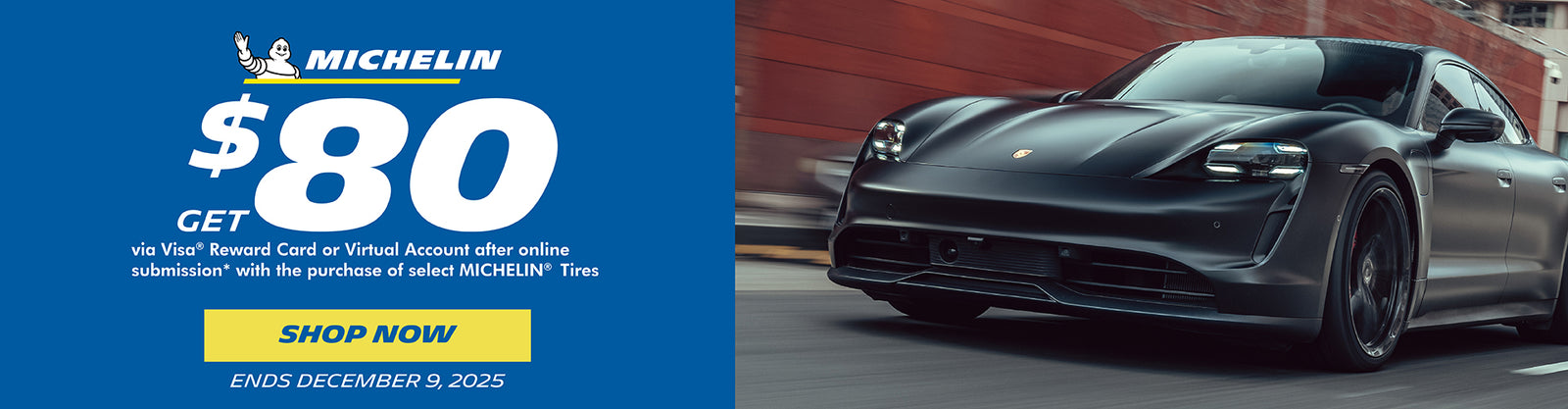When you purchase a set of four select Michelin passenger or light truck tires you may be eligible to receive $80 via Visa® Reward Card¹ or Visa® Virtual Prepaid Card² after online submission*. Offer valid on select tires purchased from in-stock inventory between 12:00 a.m. EDT September 24, 2025 and 11:59 p.m. EST December 9, 2025.