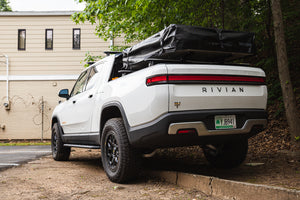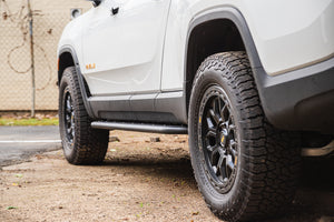 Team 1EV has engineered an innovative precision fit bolt-on rock slider for the Rivian R1T and R1S. With a strong emphasis on balancing proper design language, function, fitment, and quality for the Rivian application, the RMaxx Rock Sliders bring the convenience of a running board together with the protection of a properly engineered armored slider in a design that fits right and looks fantastic on the Rivian R1T and R1S. Our goal was to make the rock sliders look like they came from the factory. True to this goal, we didn't add any giant brand logos or out-of-style design features. The moderate face design looks right at home on the Rivian and provides sufficient grip. The boards are tucked in properly, meshing visually with the natural truck lines, and the optional rock slide armor integrates properly and DIRECTLY with the actual Rivian frame structure rail on the top side and running board on the outside edge with proper heavy-duty triangulations to the board.