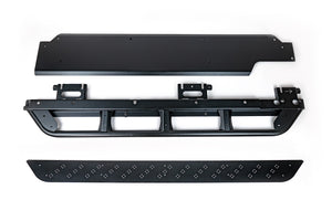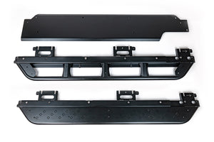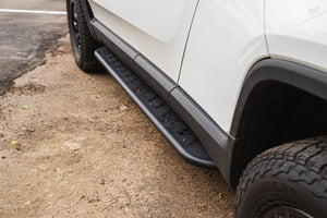 Material specifications are equally suited for the street, overlanding or Moab, take your pick, you're covered. Running boards start with CNC-bent 1.75" OD alloy steel tubing with laser cut welded frame bracketry and steel plate step surface plates. We finish all surfaces with a rugged textured black powder coating. Running boards are rated for 1000lbs load. Sliders are engineered for full confidence, starting with heavy wall 2" square tubing bolstered by several direct frame attachment points and triangulations.